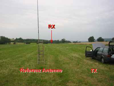Nun zum Messaufbau. Am Sender (TX) wurde also zunächst ein Referenzstrahler aufgebaut und dann mit 100W Sendeleistung gesendet. Marko nahm in etwa 400m Entfernung die Messung der Feldstärke mit einem Spektrumanalysator vor. Als Empfangsantenne wurde lediglich ein Stück Draht verwendet. Dies reichte in diesem Fall aus, da wir nur relativ-Messungen durchführten (also der Vergleich zwischen Lambda/4 Strahler und Mobilantenne). Nachdem der Pegel der Referenzantenne gemessen wurde, habe ich mit der Mobilantenne gesendet und Marko hat die Pegel gemessen. Dabei bin ich zusätzlich noch im Kreis gefahren, um zu sehen ob es eine Vorzugsrichtung bei der DK3 gibt. Da das Auto jedoch sehr klein gegenüber der Wellenlänge ist, waren hier kaum Veränderungen festzustellen. Lediglich im 20m Band (hier ist das Auto schon etwa Lambda/4 lang) war eine leichte Hauptkeule in Fahrtrichtung zu erkennen.