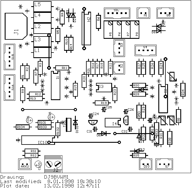 D: Bei dieser Schaltung handelt es sich um das Wattmeter von DJ9BV wie in DUBUS 3/87 veröffentlicht. Allerdings habe ich die Laderegelung durch einen integrierten Baustein ersetzt. Dieser Teil ist noch nicht im Schaltplan dargestellt. Daher benötigt diese Schaltung 12V von extern, wird aber vielseitiger und sicherer. Ebenfalls habe ich die teueren Funktionsschalter ersetzt und eine doppelseitige Platine erstellt, wobei die Oberseite komplett als Massefläche dient. Teilweise müssen also Bohrungen auf der Oberseite angesenkt werden. Die Masseverbindungen sind aber soweit möglich auf der Unterseite ebenfalls verbunden, so daß es in einigen Fällen nichts ausmachen wird, wenn man auf der Oberseite zu löten vergißt. Ich möchte darauf hinweisen, daß ich diese Leiterplatte noch nicht selbst erprobt habe.