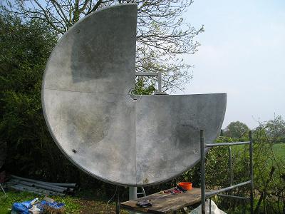 Progress update 9 July 06During the week the tracking system has been checked out and after fixing a couple of minor faults is now working. The dish has been calibrated against a compass, and a 'cross-hair' has been produced on the dish by stretching string across between the feed support mount points. By using the shadow cast by the sun on the centre of the dish I can see that the tracking is within a degree on both AZ and EL - further tests with sun noise will be made once a feed is installed. The metalwork for the feedbox is now all prepared and drilled, and assembly will take place during the next week