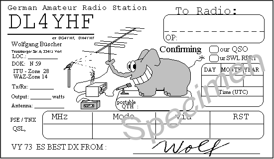 in Morse code (with an LED or piezo speaker), it's probably one of the creations at the QRL. Radio Amateurs around the world often exchange "QSL-cards" with fellow radio amateurs (sometimes called "hams", but I don't like the story behind the original meaning of "ham"..). Well anyway, "QSL" is an abbreviation which originally meaned "message received" in a conversation in morse code, the conversation (sometimes just a contact) being called "QSO" and so on. So here is one of my old QSL-cards - just in case I have forgotten to send one to you "via club". If you look close enough (and are not an email-address- harvesting robot), you will see a postal address which is still valid: