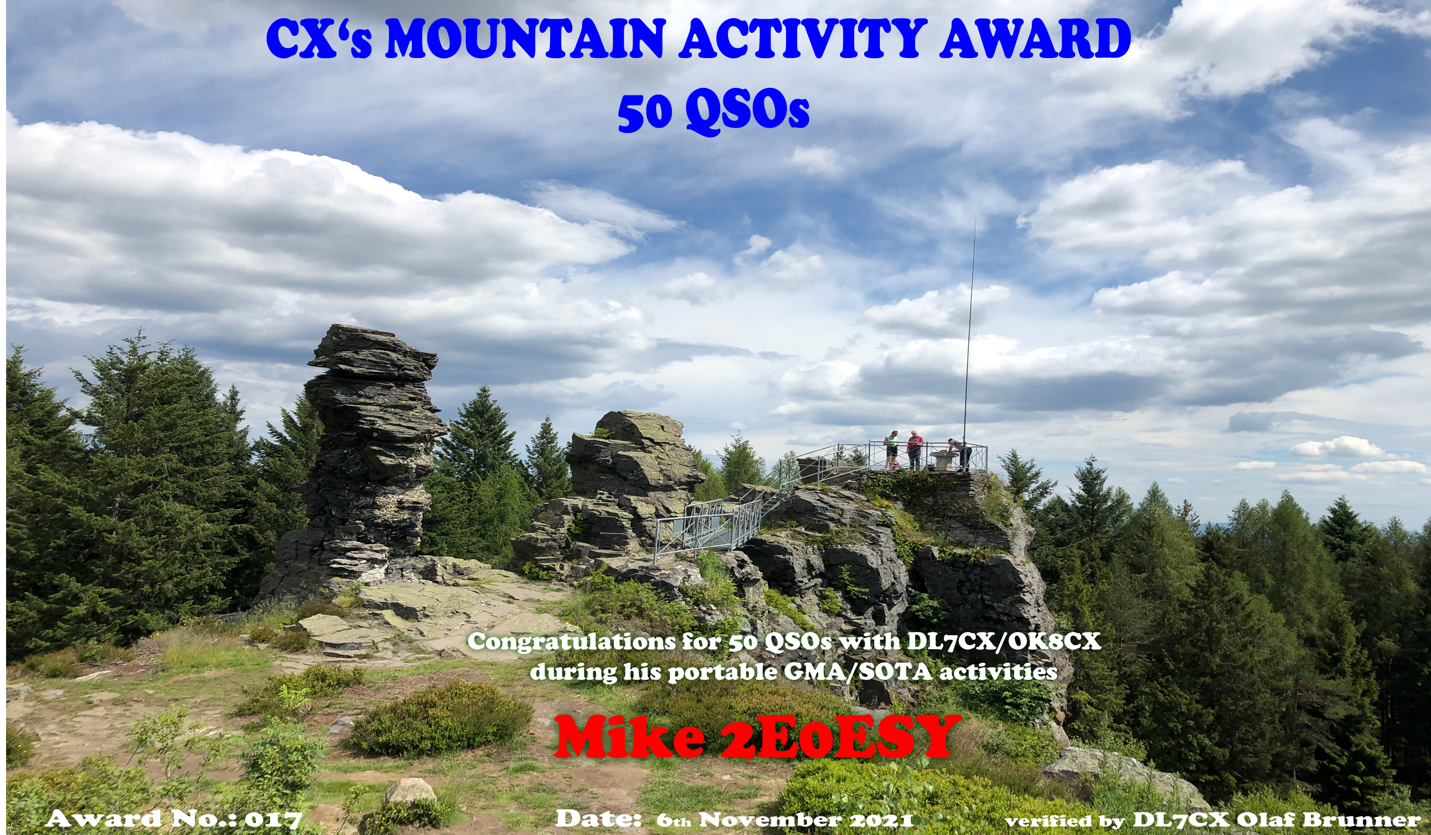 It quickly became apparent that many hunters enjoyed working with me during my portable activities. After a short time, the first radio friends had 5 or more contacts with me. Then "Corona" came and I had more time. That's when I came up with the idea of creating diplomas and automatically sending them out after 5, 10 or more QSOs. The joy and surprise was great and there were a lot of positive reactions. After almost 5 years now, the CX-1500 diploma was given to my good radio friend Pavel OK1AW, now he is the owner of a 2000 CX-award, a very special one... painted by my daughter Nele DO7CX. Manuel EA2DT got the 500 CX-award in January 2023, a hard worker! If you want a CX-award, you just need to send me an email with your callsign and I will check my entire portable log (DL7CX, OK8CX including the portable CEPT activations from TK, W0/7, HB0, OZ, OM, F, EA, CT3 and IN3). December 2024: Pavel OK1AW worked me more than 2000 times from February 2019 til the end of 2024 - a real superchaser! 2000 CX-award, a very special one... painted by my daughter Nele DO7CX