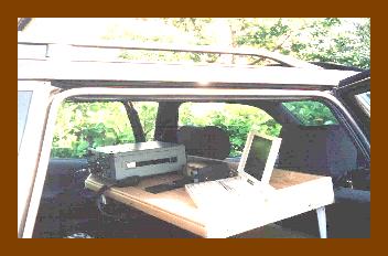 | Das ist mein VW-Passat mit meiner mobilen SSB-Station. 1 Laptop Pentium I 133er,Yaesu FT 225 RD und einen kleinen Rotor. |