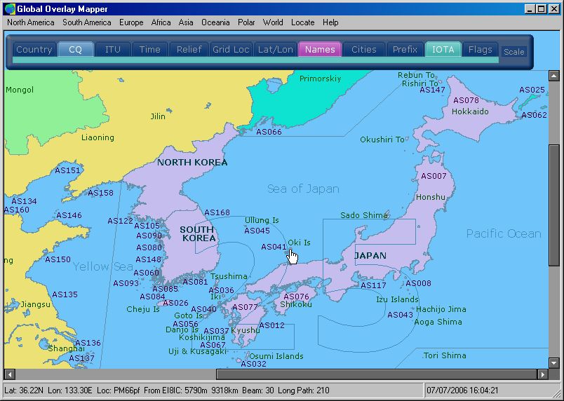 Full sized image: JPG PNG | Three overlays are visible here: CQ Zones, Country & Admin Area Names, and IOTA Reference Numbers. Note how one overlay does not mask another. Data is, as far as possible, given unique locations, for a clear and uncluttered map view; something not possible in most other Ham Map programs. |