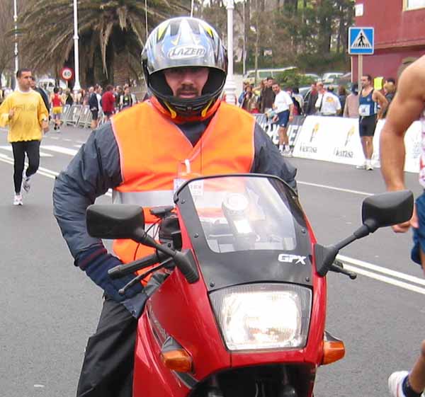 Esta carrera necesitaba una segunda estación, que pudiese circular muy próximo, a los participantes de la categoría femenina, para reportar los datos al igual que la estación de cabeza, pero de esta otra categoría, con el problema añadido de que no podría ser un vehículo grande ya que estorbaría y causaría problemas en el ritmo de las corredoras, además que entorpecería el trabajo de los reporteros gráficos, tanto cámaras de TV como los fotógrafos que cubrían el evento y se desplazaban en motocicletas al igual que el gran numero de motoristas de la Guardia Civil, encargados del la seguridad y que además pudiera esquivar los controles de ruta, por los que no podía pasar ningún vehículo, estos controles de ruta, testaban, un chip que todos los participantes llevaban instalados en su tenis y activaban el control de presencia por aquel punto, esto nos llevo a la idea de pensar en montar una estación muy poco habitual, EA1BSK, actualmente EA1RX Enrique, disponía de una motocicleta Kawasaki GPX 600R, motocicleta, que aunque es un modelo deportivo, tras las adaptaciones realizadas por EA1BNF, (jefe de logística) se adapto perfectamente a nuestras necesidades, el transceptor utilizado, fue un KENWOOD THD7E, transceptor portátil, que también trae incorporado un TNC y sin necesidad de ordenador, era el mas adecuado para esta estación, además alimentado con la batería de la propia moto obtendríamos una potencia de salida de unos 6 w aproximadamente, este iría colocado encima del deposito, dentro de una bolsa de viajes para moto, que va pegada con unos imanes para impedir que se caiga y como tenia en su parte superior un porta mapas trasparente me permitía ir viendo las operaciones del transceptor, el GPS, también de la casa Garmin, iva colocado en el parabrisas, por la parte interior adherido con una ventosa y dejándolo en la posición ideal, de forma vertical, este transceptor también me permitía tener un auricular (pinganillo) por dentro del casco, para ir oyendo cualquier aviso por fonia, trabajando con doble VFO en la misma banda, pero en distintas frecuencias, lógicamente, las manos las tenia ocupadas casi en todo momento, pero todo el montaje fue totalmente eficaz, como antena utilizamos una antena de 5/8 de onda y aunque era grande, con un talky es muy necesaria, había que aprovechar al máximo la potencia del transceptor, quedando la instalación como en las fotografías.