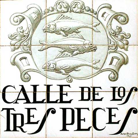 | Calle de los Tres peces: Aquí estaba la casa de Pedro de Solorzano, cuya condición era dar todos los años el día de San Francisco de Paula, tres grandes peces al convento de la Victoria, otros tres el día de San Rafael, al Hospital San Juan de Dios y otros tres, el dia de la Concepción al de San Francisco y para no olvidar la costumbre fueron labrados en la fachada tres peces de piedra |