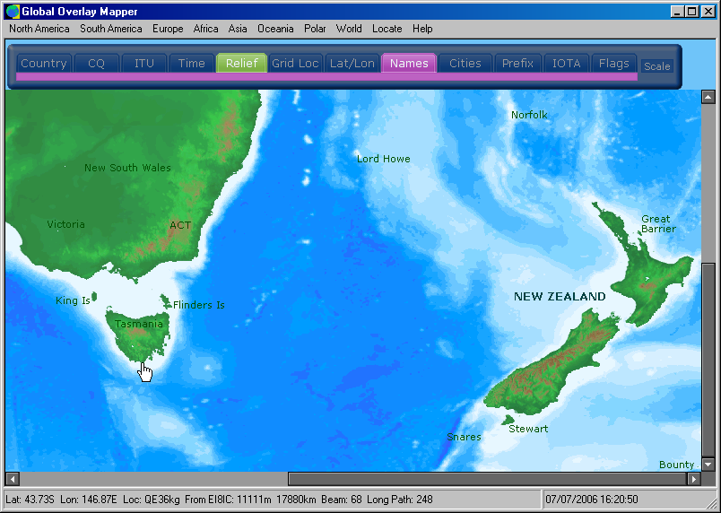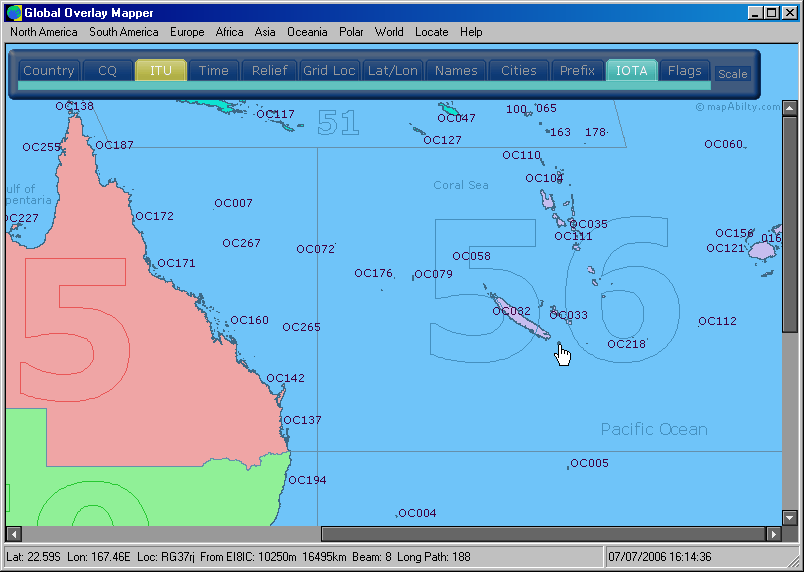 Full sized image: JPG PNG | Three overlays are visible here: CQ Zones, Country & Admin Area Names, and IOTA Reference Numbers. Note how one overlay does not mask another. Data is, as far as possible, given unique locations, for a clear and uncluttered map view; something not possible in most other Ham Map programs. |