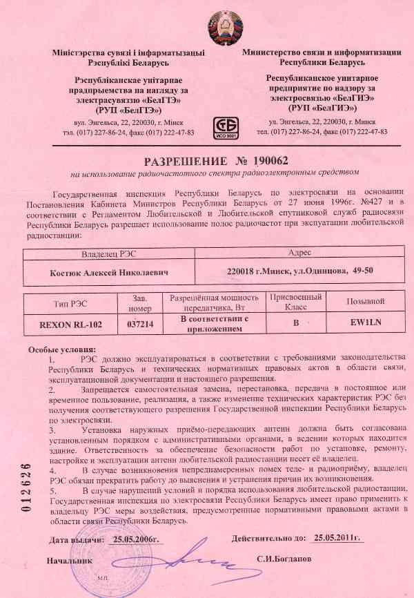 2011 новое разрешение на спектр, приклеенное к рации отдельно для каждой! |