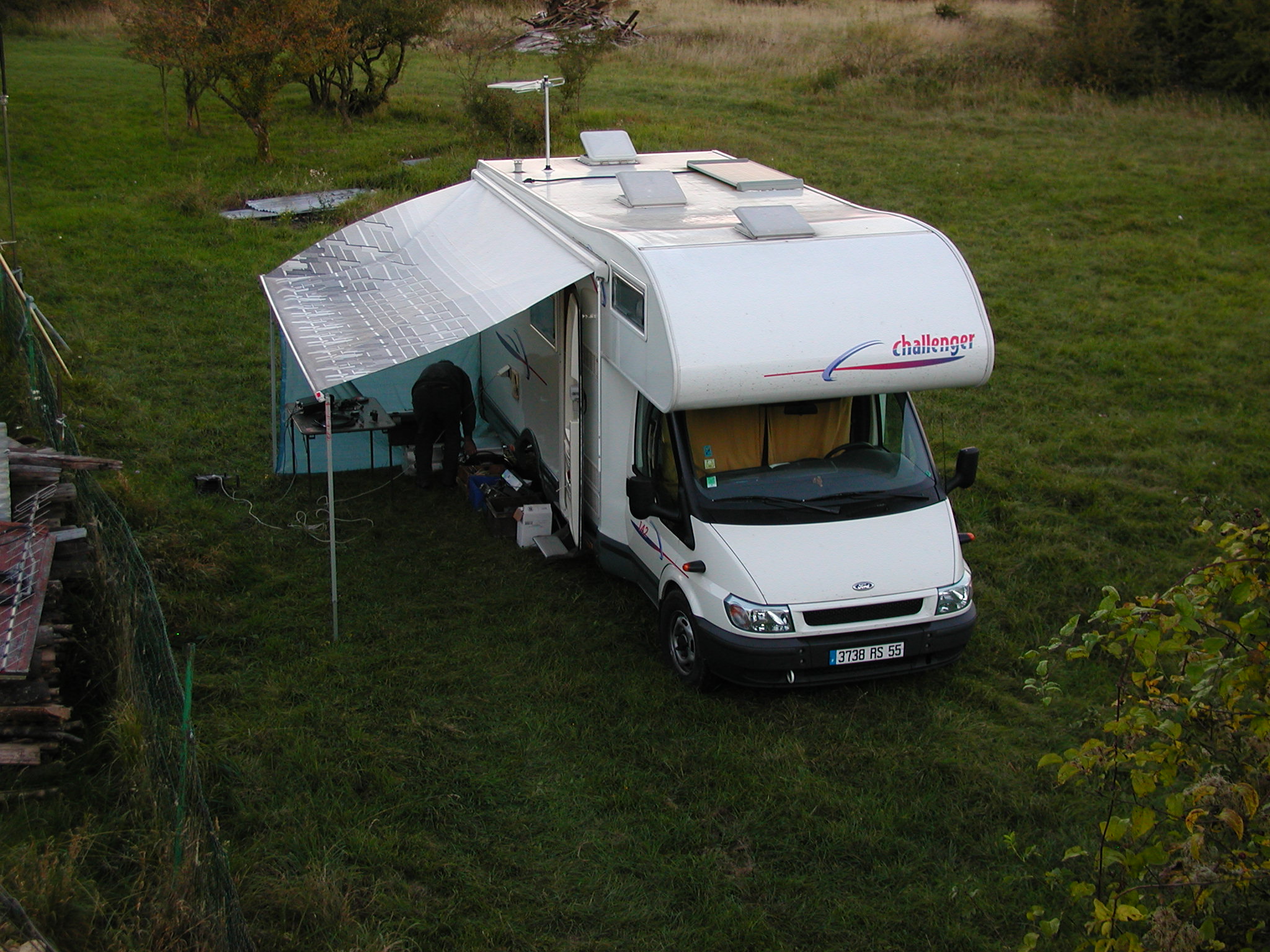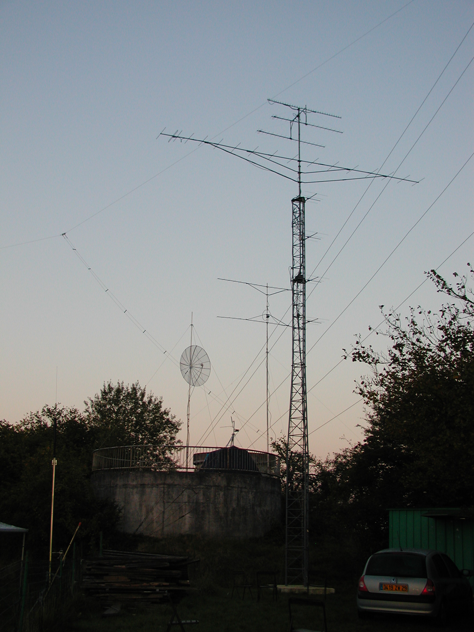 Site de Sivry-la-Perche JN29PD, dept. 55 6 & 7 Octobre 2007 Opérateurs : Olivier F1AKK (29), Sébastien F8DBF(29), Matthieu (moi) F4BUC(78), Alain F4DZI(55) + YL et QRP Que dire à part un WX magnifique, un bon trafic pour ce premier IARU UHF sans problème technique, le rêve! Nous avons installé la station contest sur le site de Sivry la Perche dans la Meuse (55), site exploité et entretenu par le radio club F6KUP de Bar Le Duc. - Propagation : Plutôt moyenne dans l'ensemble à part de très bonnes conditions le dimanche matin avec notamment Jean Noël F6APE contacté 59+ sur 10GHz! Le site de Sivry la Perche ou nous activons est situé à environ 350 m d'altitude, ce qui est trop juste pour bénéficier pleinement des phénomènes de propagation de type inversion tropo. Il suffit de comparer les distances DX de F/OK4W/P par rapport aux notres sur 1,2GHz (1000km contre 673km). Nos stations étaient techniquement similaires mais leur altitude était de 1100 m. A cette altitude nous rencontrons classiquement les zones d'inversions (je n'aime pas trop ce terme, allez voir mes articles sur ce sujet). Il faut aussi admettre que leur dégagement était meilleur (angle de visé à l'horizon plus faible, ce qui joue facilement sur quelques dB en troposcatter!). Durant un contest nous n'avons pas le temps d'analyser en finesse la propagation, mais à posteriori des analyses intéressantes sont à faire. - Activité générale: Activité très moyenne en France et comme d'habitude très soutenue dans le centre Européen, ou les foyers d'activités sont toujours vers DL, OK, PA... La grosse différence entre la France et ses pays voisins est malheureusement facile à constater en contest: en Allemagne, par exemple, il règne un esprit beaucoup plus associatif et les contests sont vus comme ce qu'ils devraient être c'est à dire des concours ou le meilleur gagne et veut gagner. En France les contests servent surtout le dimanche matin comme prétexte à remplir un peu plus le carnet de trafic mais il manque l'effort de monter des équipes et du matériel, pour vraiment participer sérieusement aux concours, à jouer le jeux, celui la même qui justement entraîne l'activité des bandes THF et l'émulation technique. Cette année le contest va être gagné par le radio club OK2KKW en portable /F. Cela fait réfléchir ! Sinon, le département de la Meuse (55) a fait des heureux ce WE sur les bandes hypers car ce département est rarement actif sur les bandes > 1,2 GHz. Faire plaisir aux autres c'est aussi un plaisir! - Technique : Ce contest a été pour moi le prétexte à la réalisation d'une nouvelle parabole de 1m80 de concept démontable en quatre pétales. Par rapport au design géodésique utilisé auparavant, ce concept a l'avantage d'être plus pratique à monter en portable. D'autre part la source associée a été changée en une source de type anneau (ou "ring feed") bi-bande 23/13 cm (auparavant j'utilisait une source de type diagonale, assez encombrante). Comparativement au système précédent, les performances sont identiques sur 1,2 GHz. Sur 2,3 GHz je ne peux comparer car nouveau, mais je suis satisfait du résultat. A optimiser plus sérieusement par mesure de bruit solaire etc... Articles à venir sur ce sujet sur ce site. Les points à améliorer sont surtout le facteur de bruit qui peut être amélioré de 2dB sur 23cm (pas négligeable!) en montant un préampli directement derrière la source. Idem sur 2,3 GHz mais je manque de données sur le facteur de bruit actuel du transceiver pour quantifier. Sur la bande 432 MHz l'apport bénéfique du préampli de fait pas de doute mais le gain d'antenne est trop juste pour assurer une PAR suffisante (nécessaire pour booster le résultat sur 432MHz et ainsi le trafic sur les bandes supérieures). Le groupement de deux fois 21el doit être complété par au moins 4 fois 21el. De façon générale la station était équilibrée en rapport émission/réception et sans problème de comptabilité radioélectrique (brouillage entre les différentes bandes). - Trafic : Nous avons, comme tout le monde, été aidés par le chat ON4KST mais cela est loin de représenter la majorité du trafic. Il faut remarquer que le chat est très encombré durant les contest et la gestion correcte de cet outil durant un contest mérite d'être menée avec beaucoup de rigueur. Nous avions deux shacks indépendants, un sur 432MHz et l'autre sur le château d'eau pour les bandes 1,2 GHz, 2,3 GHz et 10 GHz. L'expérience montre que la communication entre ces deux shacks mérite d'être améliorée pour rendre plus efficace la régulation du trafic par rapports aux skeds pris en 432MHz et KST. Sinon dans l'ensemble trafic satisfaisant sur toutes les bandes avec notamment un très bon DX sur 432MHz : HG5M en JN97 soit un peu plus de 1000km. Pas très courant! Le passage aux 200 QSO sur cette bande a été assez laborieux et pour exploiter le potentiel véritable du site plus de PAR est nécessaire. Le trafic sur 1,2GHz a suivit un rythme correct avec pas mal de QSO random sur les premières heures. Par contre les dernières heures furent plus laborieuses. Le potentiel de la station et du site conjugués doivent permettrent de réaliser une bonne centaine de QSO aisément. La difficulté pour atteindre ce but est d'améliorer les moyens permettant d'aller chercher les autre stations potentielles, plus que l'amélioration technique : ON4KST certes mais aussi en réalisant plus de QSO sur 432MHz et donc plus de skeds directs. L'amélioration technique de la station devrait ensuite assurer d'aller encore plus loin... Le trafic sur le 2,3 GHz est plutôt satisfaisant, allant de pair avec le 1,2 GHz. Merci à F5KDK/P pour les contact sur ces deux bandes. Sur cette bande le potentiel est d'au moins 50 QSO. Enfin pour la bande 10 GHz notre résultats est plus que satisfaisant. Le dimanche matin plus de QSO auraient pu être réalisés au regard de la bonne propagati