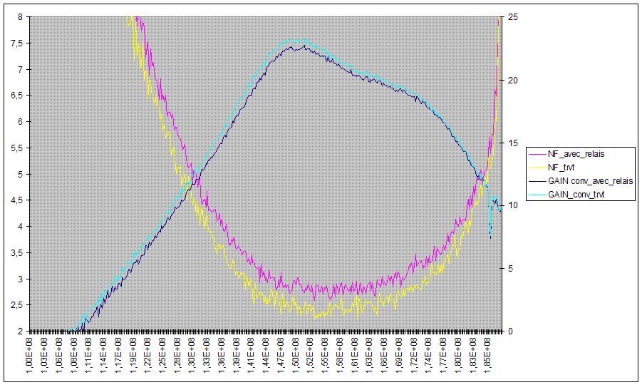 Voici les mesures donnant les performances "brutes" du transverter après premier alignement, c'est à dire sans réglage d'optimisation du facteur de bruit. Port SMA RX : "NF_trvt" et "Gain_conv_trvt". Après le relais coaxial et les transitions (une transition droite et un coude): "NF_avec_relais" et "GAIN_conv_avec_relais".