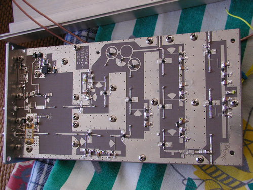 Il apparait dans la conception de ce transverter un problème lié à la mise en boitier de l'électronique. Lorsque le couvercle est refermé avec la semelle supportant le PCB, un couplage apparait entre les étages d'entrée de la chaine hyper TX et l'ampli de sortie. Ce phénomène est classiquement rencontré dans tous les designs hyper et il est traité classiquement par ajout d'absorbant sur la face interne du couvercle. Dans mon cas il a été nécessaire de rajouter de l'absorbant pour éliminer les tendances à l'accrochage. Le plus ennuyeux est que visiblement le design a besoin d'un certain effet de couplage pour augmenter indirectement le gain de la chaine et permettre d'atteindre le niveau de puissance de sortie nominal (sinon il manque 10dB de gain sur la chaine). Ce couplage indésirable apporte aussi, et de façon assez surprenante, un effet de dérive thermique de la puissance de sortie quand le transverter est en émission. L'explication semble être que la température fait dériver légèrement les caractéristiques électriques des composants (gain, impédance...) et que l'effet de couplage indésirable lié au boitier semble y être particulièrement sensible. Cela est un bon cas d'école de ce qu'il ne faut jamais faire en conception RF : compter sur l'effet de phénomènes parasites pour vouloir garantir les performances d'un circuit. Les phénomènes parasitées étant par nature mal maîtrisés il en découle que les performances résultantes du circuits le sont aussi.
