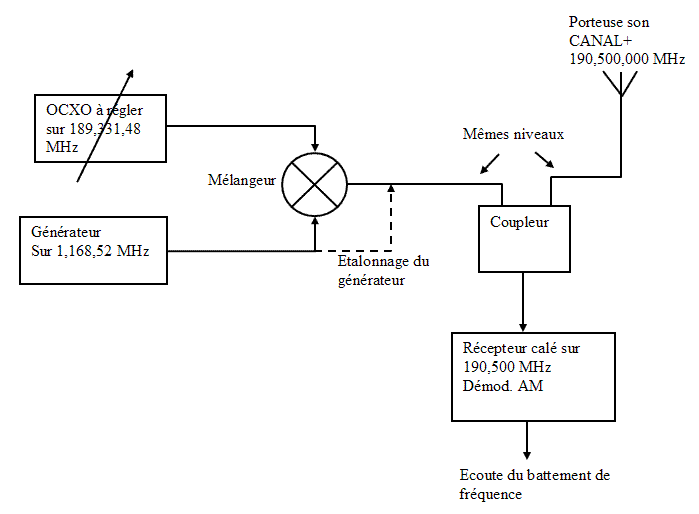 En Ile de France à mon QRA je reçois très fort la porteuse son de CANAL+. Cette référence de fréquence à 190.500.000 Hz est donc une aubaine! Le principe du banc de réglage que j'ai utilisé est alors le suivant: - mélanger le signal de sortie de l'OCXO avec un OL fournit par un générateur réglé à la différence entre la fréquence désirée de l'OCXO (189,131,480 Hz pour obtenir une FI de 144,100,000 Hz à 10,368,000,000 Hz) et 190,500,000 Hz soit 1,168,520 Hz. Cela afin de se ramener proche de la référence à 190,500,000 Hz. (désolé pour tous ces Hz !) - injecter ce signal à l'entrée d'un récepteur (ici un FT100) calé sur 190,500MHz et connecter avec un coupleur l'antenne recevant la porteuse de CANAL+. Régler le niveau du générateur afin de ramener les deux signaux au même niveau en entrée du récepteur. - le récepteur est réglé en démodulation AM. On doit alors entendre facilement le battement correspondant à l'écart de fréquence entre les deux signaux. - il suffit d'ajuster l'OCXO afin d'obtenir le battement nul. Terminé! Notez que la précision et la stabilité du récepteur n'ont aucune influence sur la précision du réglage. De même que le générateur car sa fréquence étant 100 fois plus faible et son effet étant additif sur la fréquence, sa stabilité sera alors du deuxième ordre. (Toutefois prendre un bon générateur étalonné à 100Hz prêt et le laisser se stabiliser en fréquence). J'ai pu étalonner mon générateur, avec la méthode exposée précédemment, en le réglant sur 190,500MHz et en notant l'erreur de fréquence, puis en l'interpolant par une règle de trois l'écart à 1,168 MHz. Sur l'air le réglage semble avoir donné satisfaction car maintenant mon décalage est correct à qques kHz près.