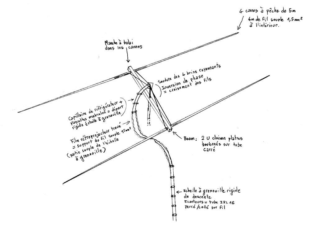 Assemblage final : il faut enfiler les cannes sur les manches à balais, puis visser les cannes en laissant 5cm entre le bout de la canne (donc la sortie du fil) et la masse métallique du boom. Une antenne de ce type possède des éléments qui doivent-être isolés de toute masse métallique. Vous pouvez ensuite souder les quatre fils provenant des brins rayonnants sur le départ de l'échelle à grenouille. Ne pas oublier de croiser un côté pour créer le déphasage, et veillez à ce que la longueur de chaque fil soit identique. Le plus simple est de vérifier la longueur qu'il reste, plutôt que de mesurer la longueur que l'on enfile.