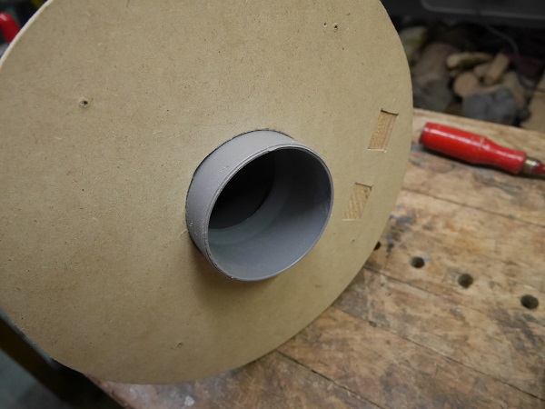 J'ai utilisé le fond de bidon qui m'a servi à faire le Thien, rien ne se perd chez un bricoleur. Je l'ai renforcé d'un disque en médium de 15mm qui recevra le cône de réduction 100/80.