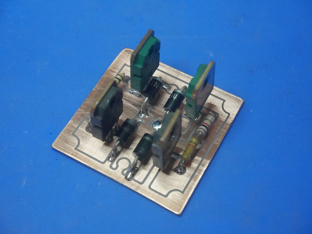 Le moteur devra pouvoir tourner dans les deux sens, il sera commandé par un pont en H construit de bric et de broc avec des transistors récupèrés sur des vieux téléviseurs, (2 NPN et 2 PNP) assez costauds pour pouvoir emmener un moteur 12v 1A sans ventilation. Il est décrit ici: Pont en H.