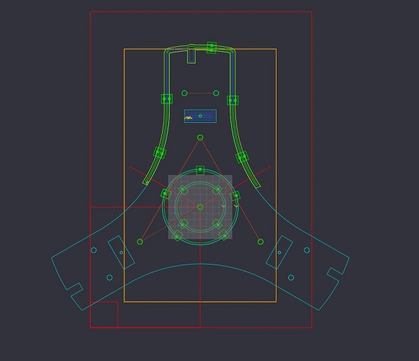 tout se peaufine sous Cambam, le cadre rouge représente la table CNC, le orange le martyr du montage d'usinage.