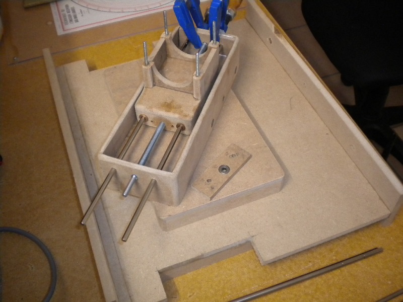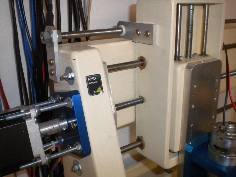 Je l'ai construite entièrement en médium, les axes et paliers ont été récupérés sur de vieilles imprimantes et les vis-mères sont des tiges filetées M8. Les moteurs pas à pas sont des nema23 de 9kg de torque et