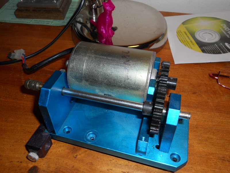 Le deuxième utilisait un moteur et des pignons de photocopieur. L'axe vient d'une dremel qui a fumée, je l'ai monté sur des roulements de roller, les pignons viennent d'un photocopieur cannibalisé. Système précis mais moteur trop lent et pignons horriblement bruyants.