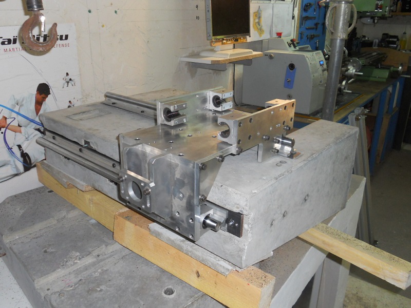 Calage au 1/100e des rails Y perpendiculaire avec la règle usinée maison. Le déplacement se fait par la translation de l'ensemble XZ.