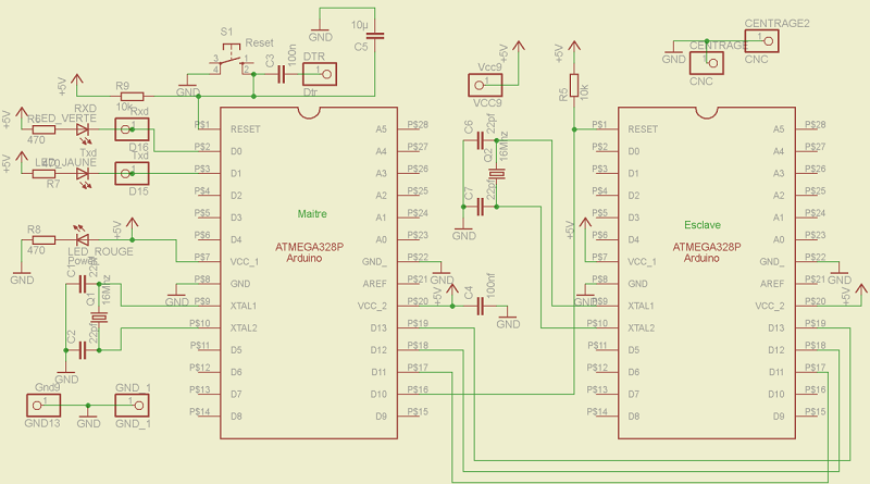 Le montage comprend un atmega328 maître et un support à insertion nulle ou se positionnera l'esclave à réinitialiser.