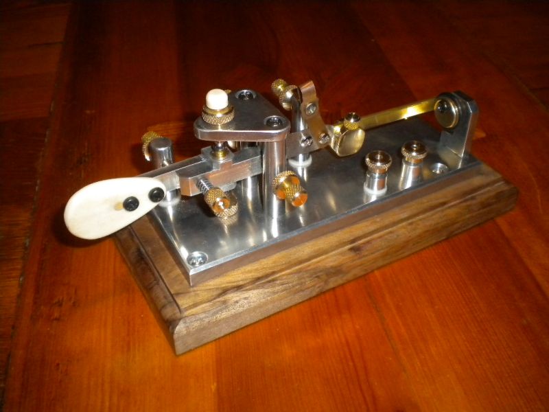 J'avais envie d'avoir un Vibroplex à la station. Après en avoir examiné quelques-uns de près j'ai trouvé que la mécanique était de bien piètre qualité et que je pouvais faire bien mieux, surtout au niveau du mécanisme. J'ai commencé par faire une modèlisation en 3D, puis un long travail d'optimisation sur l'écran avant de passer sur les machines d'usinage. Les pièces de tôle pliée des Vibroplex originaux ont été remplacées par des pièces usinées dans la masse avec paliers en bronze pour les parties mobiles. Le pivot central est monté sur deux billes, la palette et le bouton supérieur sont en os d'autruche. Et bien sur l'incontournable socle en noyer Environ une cinquantaine d'heures de travail pour réaliser cette pièce.