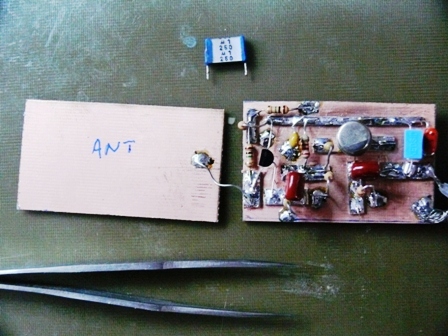 The easy and fast way of construction.The antenna probe measures 30X45mm. Larger receiving surface area overloads the amplifier. |