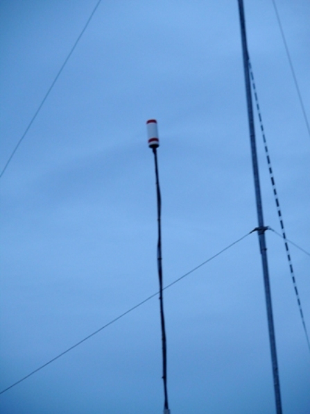 The antenna is attached to a wooden pole 4 meters above ground level. The plastic enclosure is from an empty silicon tube. |