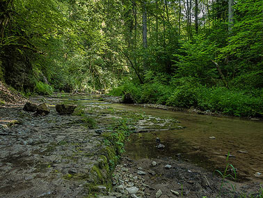 Roughly halfway along the trail, the Gauchachschlucht is joined by the Engeschlucht, a rugged ravine through which the Tränkebach stream runs. One of the published walks includes the Engeschlucht, but the stream was completely dried up, so I didn't bother to explore it. A short distance further, I reached the Naturfreundehaus Burgmühle, a former mill which is now a refreshment stop. I was looking forward to a break here to sample its homemade cakes, but unfortunately, today being its Ruhetag, it was closed so I plodded on in the humid heat. A short distance from the Burgmühle, I crossed the last bridge which looked somewhat rickety and confirmed by a sign resticting passage to 3 persons at a time. I was now on the final stretch of the trail and after passing some cliffs, both the gorge and path now widened. The river seemed to quicken pace as well. The area was quite wet due to small rivulets flowing from the cliffs and both sides of the path were covered by lush vegetation. All too soon I reached the Gauchachmundung where the Gauchach flows into the Wutach. I crossed the Wutach over the Kanadiersteg, a covered bridge built by Canadian engineers in 1976, and walked another kilometre along a wide farm road to the Wutachmühle. As I reached the bus stop, the 7258 bus to Bonndorf arrived, but I gave it a miss and walked on to the nearby Kiosk Wutachmühle, a really good Schnellimbiss. After a lunch of Weisswurst, Brezen and two Hefeweizens at the Imbiss, I caught the next bus to Bonndorf, then made my way back to Hinterzarten by bus and train. On arrival, I sat outside a café and thoroughly spoilt myself with a portion of Schwarzwälder Kirchentorte mit Sahne and a heisse Schokolade. The promised thunderstorm never appeared and the weather continued being extremely hot and sunny. I really liked the Gauchachschlucht, it's like a smaller version of the Wutachschlucht, very green and very quiet.