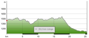The Lechweg was now about to take me in a large semicircle as I passed through the village and made my way down to a small wooden hanging bridge over the Krumach stream. This crossing marks the border between Vorarlberg and Tirol and the trail followed along the mountainside towards Gehren, then up to Lechleiten. The views across to Warth and the Lechtal would have been more impressive had the weather been clear. Lechleiten is a small farming hamlet and I saw nobody as I walked through its solitary street and reached a turnstile at the end of the village. I passed through it and was now on a section of the renowned Adlerweg, an excellent narrow trail along the side of Biberkopf.