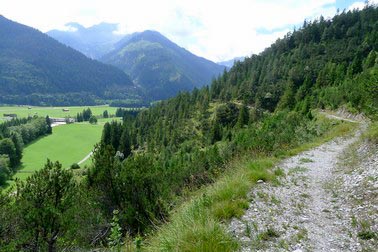 From here, I continued downwards through a beech forest until reaching a rough parking area above Martinau. Then followed the descent towards Martinau along the Krackweg, a forest road that zigzagged it's way down to the main road, bypassing Martinau and arriving at Vorderhornbach. Apparently, the mild climate of Vorderhornbach gives it the name "Merano of the Lech Valley", although I didn't see any trattorias there. As seems normal around here in the mid-afternoons, the village was dead. I left via a flat path through some farmland and reached the Lech bridge. A short walk along the other bank brought me to Stanzach. The next bus to Holzgau wasn't due for another eighty minutes. I contemplated carrying on to Forchach, but soon abandoned that idea in preference for sitting in the town square drinking Hefeweizen in the afternoon sunshine to pass the time away. The Elmen Panoramaweg had been hard going and my feet had taken another battering on it's unforgiving surface.