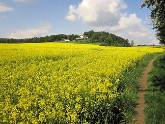 Schöna is a small village with probably less facilities than even Altendorf and the trail started off in an uninspiring manner along a tarmac road between fields of rape and village houses. The only compensation was that I had views of the Schrammsteine along the way. Eventually, after passing Reinhardtsdorf, I reached a turning up into a small wood with a sign which informed me I was now on the Casper David Friedrich Way. This led me towards Krippen and at last I was on a decent forest trail which continued all the way to Kleinhennersdorf. Above this village was the best view so far of the Schrammsteine. Around this time,I also noticed a worrying development in that the little toe on my left foot was becoming quite painful. There was a white, tender area on the inside of the toe, later identified to be a soft corn, which I covered with a Compeed patch, but more worrying the whole toe hurt as I walked. This was possibly due to not tying the laces tightly enough yesterday before making the rough, steep descents. From Kleinhennersdorf, I walked up through a small wood past a nice pond until I crossed a main road.