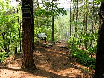 The trail continued in a semi-circular route along the edge of a forest with large farm fields on my left side until I reached the Brennesselecke, which afforded me my final view of the Schrammsteine. As I left the farm fields behind, the trail started it's climb up to the Papststein. After a short time I found myself walking along a pretty rocky ledge with views across to Papstdorf. A short distance further ahead, I encountered the first wooden and stone steps of the day which took me to the summit of the Papststein. It was crowded at the flat summit and the cafe there was also quite busy. There were excellent views from the summit across to Kurort Gohrisch and the Lilienstein. Unfortunately, taking a seat on the cafe's terrace coincided with the arrival of a group of over 15 people. Despite my best attempts, the waiter successfully managed to totally ignore me. I can only assume he always discriminates against tramps wearing Tilley hats. After 20 minutes of this silly game, I left and made my way down and across to the Gohrischstein. The Gohrischstein is another flat-topped sandstone mountain, with more ladders and steps to contend with. After my experiences on the Papststein, I was now relieved to see there was no cafe, ignorant waiter or hordes of people there. Sanity restored, I made my way down to the village of Kurort Gohrisch with my left foot now in considerable pain.