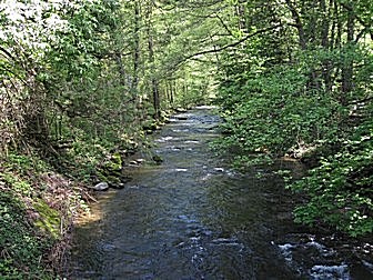 After another 3 miles, as I was starting to get bored with this road, the trail suddenly took a sharp left turn onto a very narrow path. This path was under a canopy of trees with bright green foliage everywhere. It was like a scene from a fairytale. I was almost expecting to see Bambi or other woodland cartoon creatures any moment. Underneath was a carpet of wet leaves, so the ground was soft and a little slippery. As well as being narrow, there was an almost vertical drop at the right side of the trail, which wouldn't make this route too enjoyable for anyone who suffers from vertigo. However, I found it totally enchanting. At various spots, there were lookout points with stunning views down to the road and river in the gorge. The trail followed a stream downhill until it reached the river at the WehraBrücke.