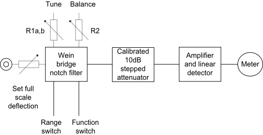 As with the Wein bridge oscillator there are two capacitors per range and a dual gang potentiometer is used for tuning. Sufficient gain must be provided so that distortion products may be sufficiently amplified to indicate on the meter. For example, if you need to measure 0.1% distortion then at least 60dB gain will be required after the notch filter.