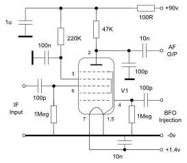 1b. Heptode with direct BFO injection to grid 1. This circuit shows lower average gain than the above circuit but with no visible distortion.