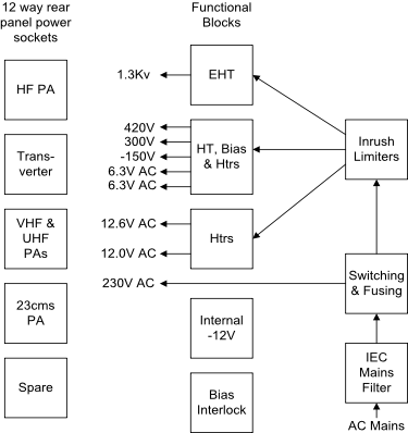 The block diagram to the right shows the various supplies and their respective modules. Each rear panel outlet has a 230V AC supply for cooling fans and unusual supply voltages that are impractical to include in the main power supply unit. Most but not all of the external units use the 12/12.6V heater supplies. The 23cms PA will use the two 6.3V supplies which will remain isolated from ground.
