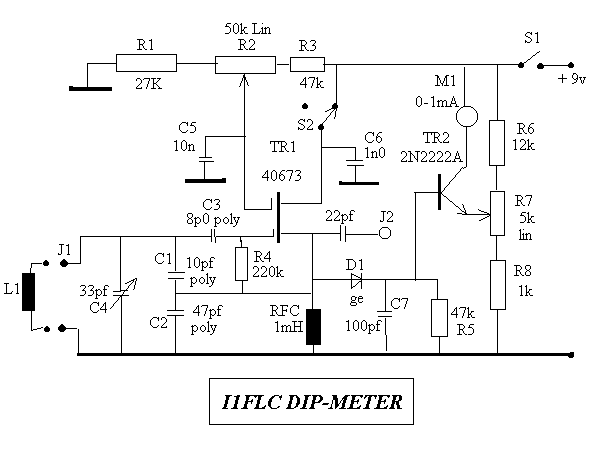 This circuit was developed by Luigi Falcone, I1FLC. He uses seven plug in coils covering 3.0 to 30Mhz in a Colpitts oscillator circuit. The coaxial socket J2 permits connection to a frequency meter when required. The coils are wound on Teflon formers with two "female" sockets which plug-in to two "male" sockets on the instrument. TR2 forms a DC amplifier permitting the use of a 1mA FSD meter with sensitivity controlled by R7. With TR1 switched off (via S2) the instument forms a field strength meter/RF sniffer.