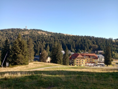 From the bus stop, I made my way to the Albsteig portal at the car park of the ski resort complex of Feldberg. Ski resorts don't have too much appeal in summer and the Feldberg area is no exception. It was totally deserted and all facilities were closed, so looked a forlorn site. The way ahead for the western variant was alongside the Grafenmatt ski run. I started the walk uphill on a tarmac road for a while before the trail diverted into woodland until reaching the top of the Grafenmatt. Ahead of me about a kilometer away, I could see the treeless summit of the Herzogenhorn, the highest point of the Albsteig. When I reached the Herzogenhorn summit, I was rewarded with a 360° panoramic view. To the north, the Feldberg summit with its unmistakable tower dominated the landscape and the south provided a good view over the valleys towards Bernau and Sankt Blasien. I could vaguely make out the peaks of both the Bernese Oberland and the Vosges through the early morning heat haze.