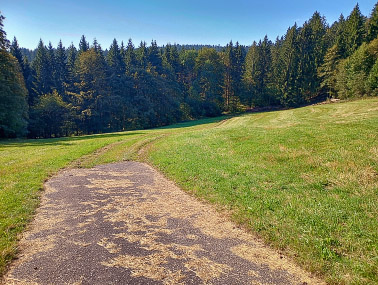 At the end of the forest was the Dachsberghalle and a Kindergarten where I was astounded when the Albsteig signs guided me into a children's playground. I was relieved to see another sign at the other end of the playground, which implied I hadn't just lost my mind. Through the playground gate was a small forest walk with many information boards. My trail descended through another forest on a narrow trail until reaching a tarmac road. From there, I walked up through a large open meadow until reaching the Bühl viewpoint above the village of Wolpadingen. There were superb views from here all the way to the Alps. Individual mountains could be identified via a bronze plaque which showed the named peaks. A picnic bench was also here, so it was an ideal place for lunch. As I sat there in the hot sun adnmiring the scenery, I felt relaxed and contented.