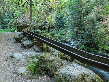 After the mill, the scenery gets wilder and the path gets narrower and more exposed as it follows the Ravennabach which is now noisily crashing over boulders. I was now in the narrowest part of the gorge under towering cliffs and a green canopy formed by the trees and soon passed the Kleiner Ravennafall with its 6 metre drop. This was great walking and I had not yet met any other hikers so was able to enjoy the scenery with no distractions. Further on, I reached the Große Ravennafall. This impressive waterfall has a 16 metre drop and is the highlight of the Ravennaschlucht. The path led down steep steel steps alongside the falls and I was able to walk back along the stream from the bottom of the steps to gain a better view. After taking some photos, I clambered back over rocks to the base of the steps where the peace of my quiet morning was immediately shattered. There was a horde of around 50 American tourists, most of whom were wearing inappropriate footwear, making their way up the narrow duckboards towards the waterfall. Obviously some tour buses had stopped at the bottom of the ravine and pointed their visitors in the direction of the waterfall. Unfortunately, they seemed to have been allowed little time and although I recommended they make their way to both the Großjockenmühle and Kleine Ravennafall, they almost immediately made their way back down the gorge. From the Grosse Ravennafall, it is just a short walk to the end of the Ravennaschlucht.The Ravennaschlucht was as beautiful as I remembered and I was pleased to have walked it again As I exited the gorge, I passed the Galgenbühl, a 30m high mound which in bygone times featured a gallows and was used as an execution site, then walked under the 58m high Ravennabrücke, the viaduct of the Höllentalbahn. A Christmas market takes place on the Advent weekends under the illuminated viaduct. I was now at Hofgut Sternen, a major tourist trap of the Höllental, with shops selling cuckoo clocks, demonstrations of glass blowing and how to make Schwarzwälder Kirschentorte. I stopped for a coffee at the Hotel Hofgut Sternen. The whole area was extremely busy and quite a few tour buses were parked there. As part of her bridal journey from Vienna to Versailles , Marie-Antoinette is said to have stopped in the Hofgut Sternen in 1770. Johann Wolfgang von Goethe also stayed there in 1779. Away from the main tourist area is Saint Oswald�s Chapel (built 1148), but I didn't visit it on this trip due to it being very busy with many tourists.