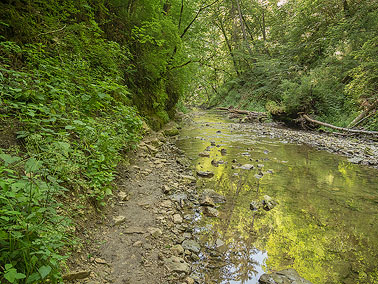 The Gauchachschlucht is another of the side gorges that flow into the Wutach and walking it today would complete my planned walks of all 3 gorges. It begins below Döggingen, where the Gauchach has eaten deep into the hard shell limestone rock. Due to the steep slopes and difficult access, the gorge has remained in a natural state and the narrower area of the Gauchachschlucht is designated as a nature reserve. To reach the trailhead at Döggingen, I took the rail replacement bus from Titisee, arriving at 0845. It was another hot day and quite humid. I brought my waterproofs as thunderstorms had been forecast. From the bus stop, I quickly reached the end of the town and was pleased to see the route was well signposted. I was greeted by a herd of goats as I set out on the road through wide meadows with expansive views. The road skirted the edge of a small forest until I reached a narrow path which led very steeply down through thick forest to the Gauchach. Soft dead leaves under my boots soothed my feet after the approach walk on the hard tarmac and gravel roads. The gorge was quite narrow here and was quite beautiful with rugged limestone walls and a diverse assortment of flora. Following the riverbank, the meandering trail took me sometimes at river level and sometimes along narrow ledges, some secured with a steel cable, a few metres above the Gauchach which ran quite slowly over large flat bedrocks. Much of the way was quite wet due to the proximity of the river and everything also appeared to be covered with a wet dew, so I took extra care when walking. I certainly wouldn't attempt this walk with the Gauchach in full flood. The trail also had nine bridges to cross, all were quite rustic and added greatly to the charm of the Gauchachschlucht. It was very quiet in the gorge with the only sounds provided by a few birds and the constant rippling of the water and I was enjoying the walk.
