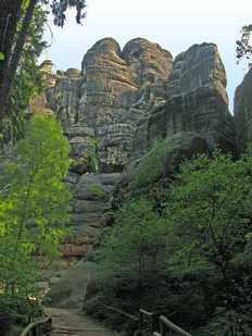 When I eventually reached the end of the ridge, the trail doubled back around the rear of the Schrammsteine until I reached a clearing which had an excellent view. To my left was the Schrammsteine, to my right the Affensteine and the solitary Falkenstein was straight ahead. A very steep path provided with ladders and steps led downwards. The Sandlochweg trail through the forest from here was actually sand for quite a distance. This didn't last and the Affensteinweg soon led to one of the typical nasty gravel roads through a forestry area. I really dislike this type of road surface and remain convinced only the sharpest, pointiest stones are specially selected to make the appalling surface. It may be OK for driving Land Rovers along, but the stones can be felt through even the thickest Vibram soles and makes walking unpleasant. Fortunately, the tedium was interrupted by views of the high vertical rockfaces of the Affensteine.