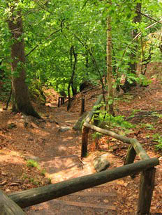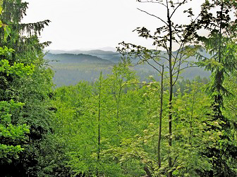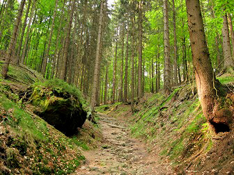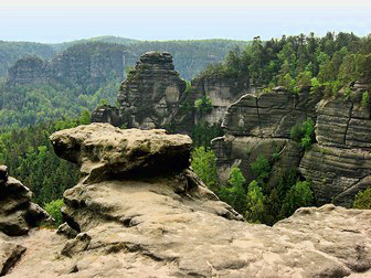 This was a rough walk uphill with many tree roots and rocks to contend with, but it was quite beautiful in the early morning's dappled sunlight. Along the sides was bright green foliage of ferns and moss and also some immense boulders, relics of the last Ice Age. The section was very reminiscent of the Appalachian Trail sections I'd walked in New Hampshire. I continued until reaching the summit of the Grosses Pohlhorn, where I made a short detour to a viewpoint. Not only was the view from here excellent, I had the unusual luxury of enjoying it in complete silence, no bird song, no people, no vehicles. From here, I started the Dreisteigensteig, making my way down many wooden steps from the summit and crossed a bridge over the Kirnitzsch river. The trail upwards from here was even rougher than previously. At the peak, it then went down gradually until reaching a road where the Altes Zeughaus stood. This was once an armoury where Royalty kept their hunting weapons, but today is a restaurant. I met the 4 German hikers again here and swapped experiences over a Hefeweizen.