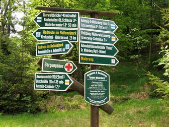 The next section of the trail will remain long in my memory. The Rosssteig was a long, relentless walk up a steep path. It seemed to go on forever and was quite tiring. I was certainly glad I'd brought my Lekis with me on this trip as they definitely saved my knees from much suffering and now helped to propel me up the Rosssteig. After eventually reaching the top, to the left was the Goldsteinaussicht. From here were views over large parts of the Sächsiche Schweitz. Whilst enjoying the views, I heard the first claps of thunder. A little further along the trail near the Katzenstein, it started to rain at last. As I'd already had glorious sunshine for the previous four stages, I wasn't too dismayed by the change. The trail followed the Fremdenweg through quite a boggy area where there were wooden walkways in places. It was now raining quite heavily when I arrived at the summit of the Grosser Winterberg (560 metres). There were no clearings with any views and I went into the restaurant for lunch. The 4 Germans were already here and beckoned me to join them for lunch. I stayed for almost an hour, which is a long time for me when hiking. On leaving, the rain had lessened and I started the steep descent down the Bergsteig towards Schmilka. It soon stopped raining and the way down was a combination of wooden steps and flat stone slabs. All were covered in wet dead leaves, so I descended with caution. The sleepy little border village of Schmilka marked the end of the Malerweg on the right bank of the Elbe. There is very little at Schmilka, only a couple of restaurants and pensions, although I was impressed it managed to maintain its dignity, unlike Hrensko just across the border.