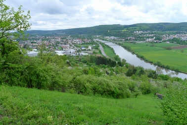 The whole ravine was incredibly muddy and very slippery. Normally, it's best to ascend ravines when they are in this condition, but I had no choice. However, steel ropes had been provided to assist through the difficult sections. The Margerethenschlucht is quite beautiful and I stopped many times on the steep, treacherous descent to take photos. I met quite a few people, mainly wearing inappropriate footwear and over-reliant on using the safety ropes, struggling to make their way up the gorge. I eventually reached a walker's hut at the end of the Margarethenschlucht and had a celebratory shot of Obstler from my hipflask. From here, the trail followed a wide walled track along the cliff face overlooking the Neckar. This continued for another 2Km until I reached the day's end at Neckargerach station. I had a 50 minute wait for the hourly train, but there was a kneipe located conveniently opposite the platform, so I relaxed with a Hefeweizen until it was time to return to Mosbach. The Frühlingsfest in Mosbach had attracted many visitors, with much bratwurst and beer being consumed by the revellers