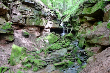 At the top of the trail, I exited the woods next to a Bismarck Tower and crossed through a large glider field. At Hamberg, the trail continued along a stretch of tarmac road (ugh) until I entered a wood of the Geo-Naturpark Bergstraße-Odenwald. Most of the paths were very muddy and slippery, so progress was a little slow along the Schreckberg near Diedesheim, I also had the occasional view of the river on the south facing parts of the trail. As yesterday, there were many bilingual information signs which enhanced the experience of walking through this ancient woodland. Entering now into the denser Binau Forest, it was very pleasant to be walking along in dappled sunlight amongst the bright green spring foliage, accompanied by much birdsong, including the occasional woodpecker and cuckoo. The map shows the Neckarsteig making an odd loop in the forest. Although I was originally doubtful of the reasoning for this, I followed the trail down to it anyway. It was well worth the effort as this area was incredibly beautiful. The whole loop was very damp which no doubt was the reason it was almost completely carpeted with wild garlic and the white of the flowers set against the green foliage was an incredible sight. Reaching the end of the forest, there was a fine view across to Binau and the Neckartal. Also visible near Binau was Germany's first nuclear power station (now decomissioned). After another kilometre, I stopped for lunch outside a forester's hut then made my way back into more forest until I reached the top of the Margarethenschlucht