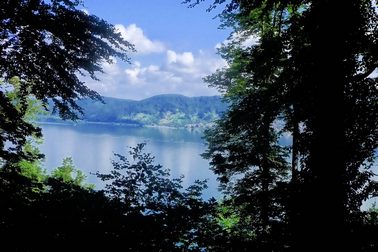 Through occasional gaps in the trees, I caught glimpses of the turquoise blue lake and the villages and towns on the opposite shore.