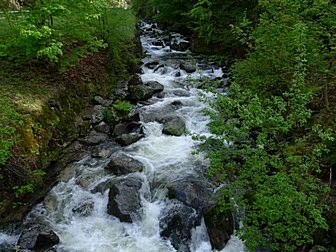 The day had now become hot and sunny, so it was good that I started early today. I crossed the river and main road and started a very steep ascent on the other side on another narrow trail. The vegetation wasn't as lush on this side of the road and the path was drier. The trail wound along the mountainside for quite a distance. There were dead trees obstructing the path in places which made harder going than on the other side of the road. Eventually, I reached a forestry road and had my first glimpse of Wehr, about 3 miles away. The road ended at a reservoir dam and I followed a footpath alongside the river Wehra, passing by football pitches, tennis courts and some large gardens. The path also passed next to a mini-golf place which had a large sign welcoming Schluchtensteig Hikers. A game of crazy golf wasn't high on my agenda for the day and as their facilities didn't include a bar, I carried on along the footpath instead. After a mile, the footpath ended and I went up to street level. 20 yards further at 13:10, I reached the Altes Schloss, the end of the Schluchtensteig.