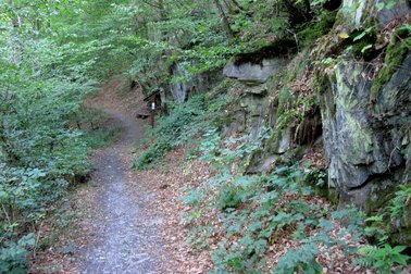 After the Blickenstein, the going was much easier as the trail slowly descended through some woods until reaching the B241 main road in the Simmerbachtal valley. This is the normal endpoint of this stage. It is in a remote area, requiring a 2.2Km walk to Gehlweiler to catch an infrequent bus to Gemünden where I had an overnight reservation. As it was only early afternoon, I decided to carry on and finish the day closer to Gemünden, so crossed the Landstrasse to the Simmerbach. A footbridge, specially constructed for the Soonwaldsteig, took me over to the other bank of the Simmerbach. The Soonwaldsteig continued along the east bank of the stream for a short distance until I was confronted by a 275 metres climb up over scree slopes and past quartzite rocks. This was a brutally steep climb and my calf muscles were burning when I completed the first part of the climb at the edge of the old quarry of Gehlweiler. The remaining section was equally tough and I was relieved to reach the top. Someone had thoughtfuly installed a bench at the summit and I gratefully flopped out on it, quite exhausted. From the summit, the trail became much easier as I walked along a broad level path and had occasional views northwards over Gemünden and its castle. I was now in the Großer Soon. After quite a way, I noticed the Soonwaldsteig signs had now disappeared, so realized I had missed the turnoff for the ruins of Burg Koppenstein. As I had almost reached the tarmac road, I decided both the ruins and mystery of the missing sign could wait until tomorrow. From the tarmac road junction, I followed the yellow "Soonwaldsteig Zuweg" signs which brought me down through the woods to Gemünden, where I had a reservation at the Hotel-Restaurant Gemündener Hof. It was a warm sunny evening and I was able to eat dinner outdoors after another great day's walking.