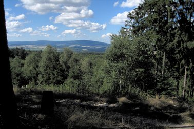I had reached the start of the Lützelsoon forest, where many trails intersected. My trail took me up to a clearing on the rocky ridge of the Lützelsoon. This is the Teufelsfels, located on a rocky scree slope, with a stone-built lookout tower, picnic table and rest bench. I climbed to the observation platform at the top of the tower and was rewarded by fine panoramic views. To the north, I could see over Bundenbach into the Hunsrück heights. To the west lay the Hochwald and to the south, the Donnersberg. Eastwards I could see little as I was level with the treetops of the dense forest, where the trail would next lead me. From the Teufelfels, the trail followed the ridge. I was in dense (mainly beech) forest where the floor was just quarzite rock boulders and it was not possible to identify any discernable path through the jumble of rocks. It was tough and slow progress through the forest as I tripped over quartzite rocks and tree roots whilst making my way along the ridge. I had to concentrate all the way, memorizing where the last marker was, to ensure I didn't get lost. As well as the Soonwaldsteig signs, the way ahead was occasionally marked by some frontier marker stones and cairns. In some places, I navigated by guesswork, just remembering to stay on the prominent ridge and not deviate downwards to the left or right. Eventually, I reached the end of the rocks and continued along a normal forest path. This took me to Blickenstein, a collection of rock formations at the edge of the ridge with intermittent views to the south through the gaps in the vegetation.