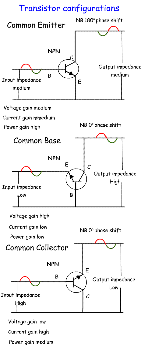 voltage gain and phase change. The transistor circuits looked at so far have all being configured with a common emitter. i.e. the input is between the base and emitter and the output between the collector and the emitter. There are other ways of connecting up a transistor to form amplifiers for small signals. These will have an effect on the input and output impedances, the current gain, the voltage gain and phase changes. The three configurations we will look at are: Common emitter Common base Common collector (Emitter follower) We will look at these for an NPN transistor. To make life easier we have taken out the resistors from the drawings. Common emitter This is a high current amplifier. To make it a voltage amplifier then a load resistor or a tuned circuit is placed between the positive line and the collector. The voltage is taken off the collector via a capacitor. The common emitter is the most common configuration. Common base The gain is 1 or less meaning that the common base configuration often acts as an attenuator. It is used in microphone pre-amp circuits and RF amplifiers, where the earthed base acts as a screen between the input and output. It can be used to match a low impedance to a high impedance Common Collector ( Emitter Follower) Voltage gain low or even zero Widely used as a buffer amplifier for example following an oscillator where its high impedance prevents pulling of the oscillator frequency. Also used an impedance matching device. |